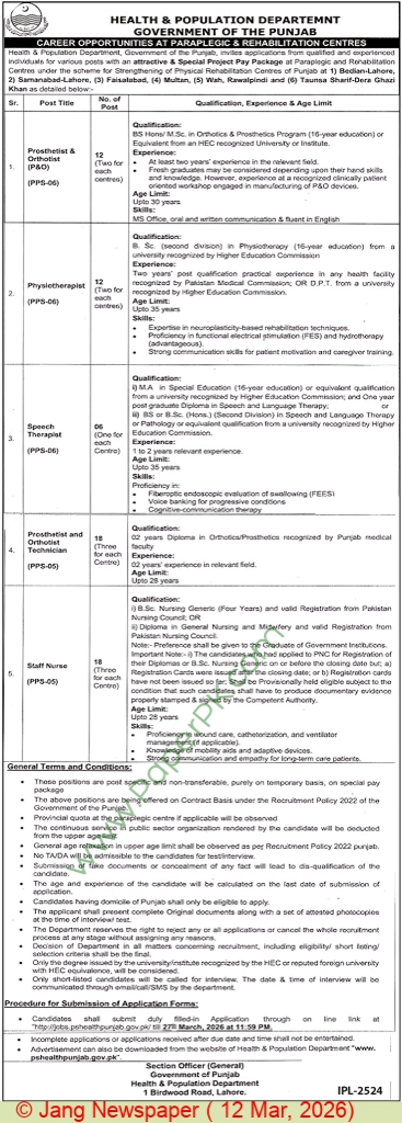 The Health & Population Department Punjab has announced multiple job opportunities at Paraplegic and Rehabilitation Centres across Punjab under a special government project. These positions offer a good opportunity for qualified healthcare professionals and technicians to work in the public sector and contribute to rehabilitation services in the province. Interested candidates who meet the eligibility criteria should submit their online applications before the deadline to be considered for these positions.
