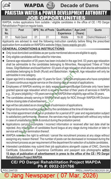 Looking for government jobs in Pakistan? Apply now for WAPDA Naib Qasid Jobs 2026 at the Dargai Rehabilitation Project. Check available vacancies, eligibility criteria, required documents, application procedure, important dates, and official advertisement. Secure your stable career in WAPDA – submit your application on time and don’t miss this opportunity!
